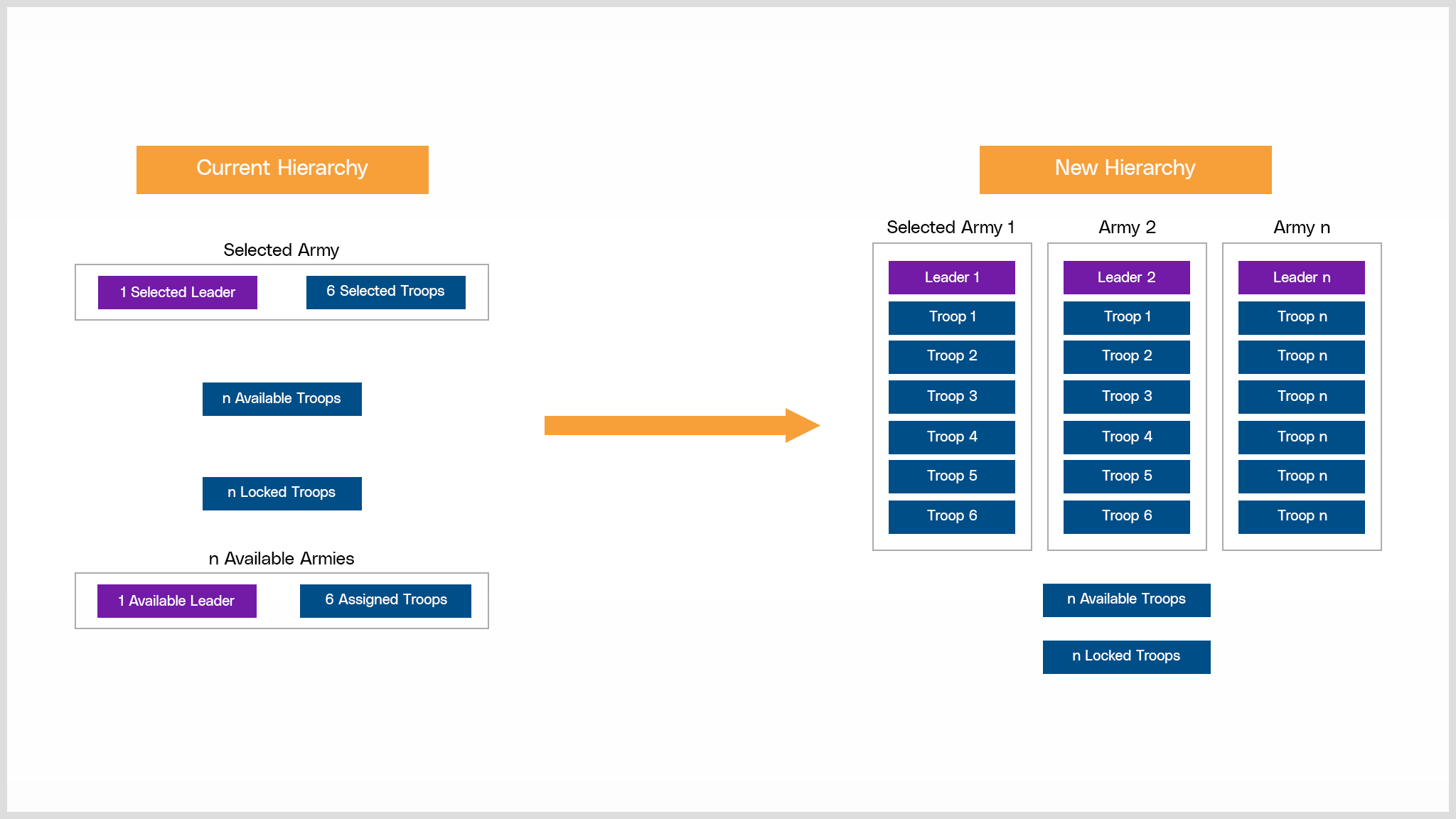 Making Leaders visible on the screen at all times to establish it as an entry point to the players armies would establish the Leader-Troop Hierarchy. This could be achieved by always keeping the Leader Selection process visible on the screen. This change would also work positively for the planned future cosmetic changes which shared a 1:1 relationship with each Leaders as well.