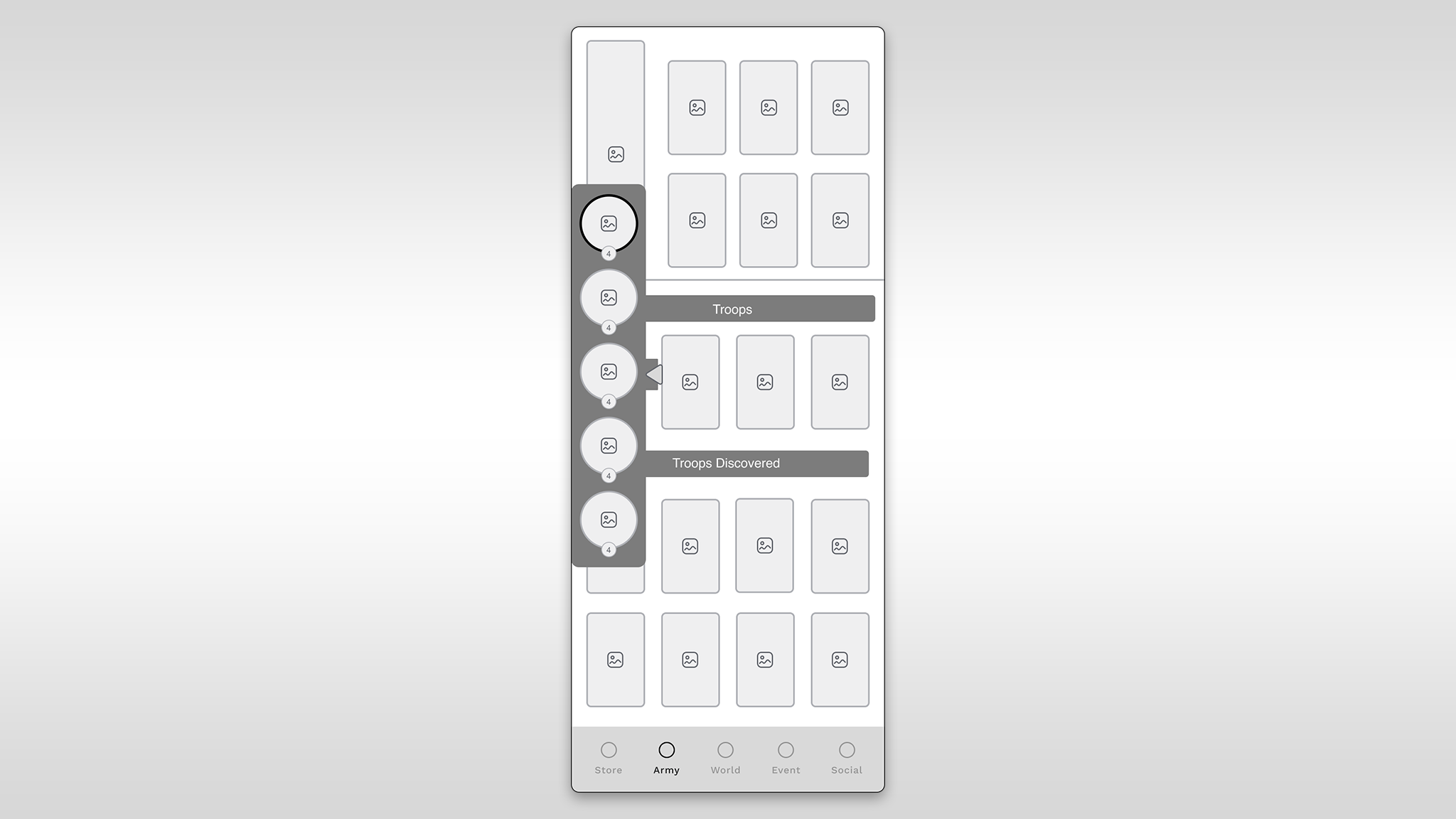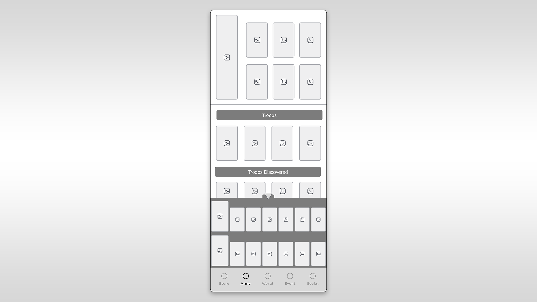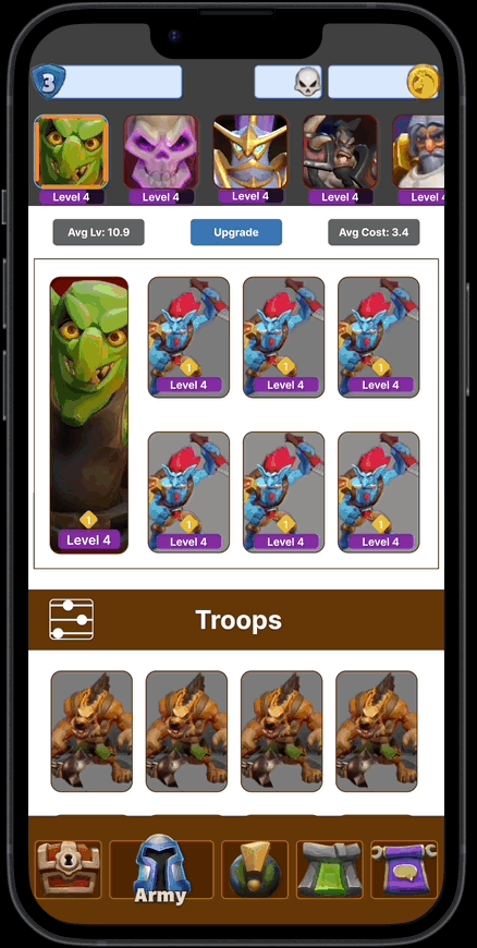 New Leader Select Flow: Unlocked Leaders are prominently displayed at the top of the Army Screen.Horizontal scrolling facilitates easy access and expands as more Leaders are unlocked.The widget is frozen at the top of the screen, ensuring constant visibility.