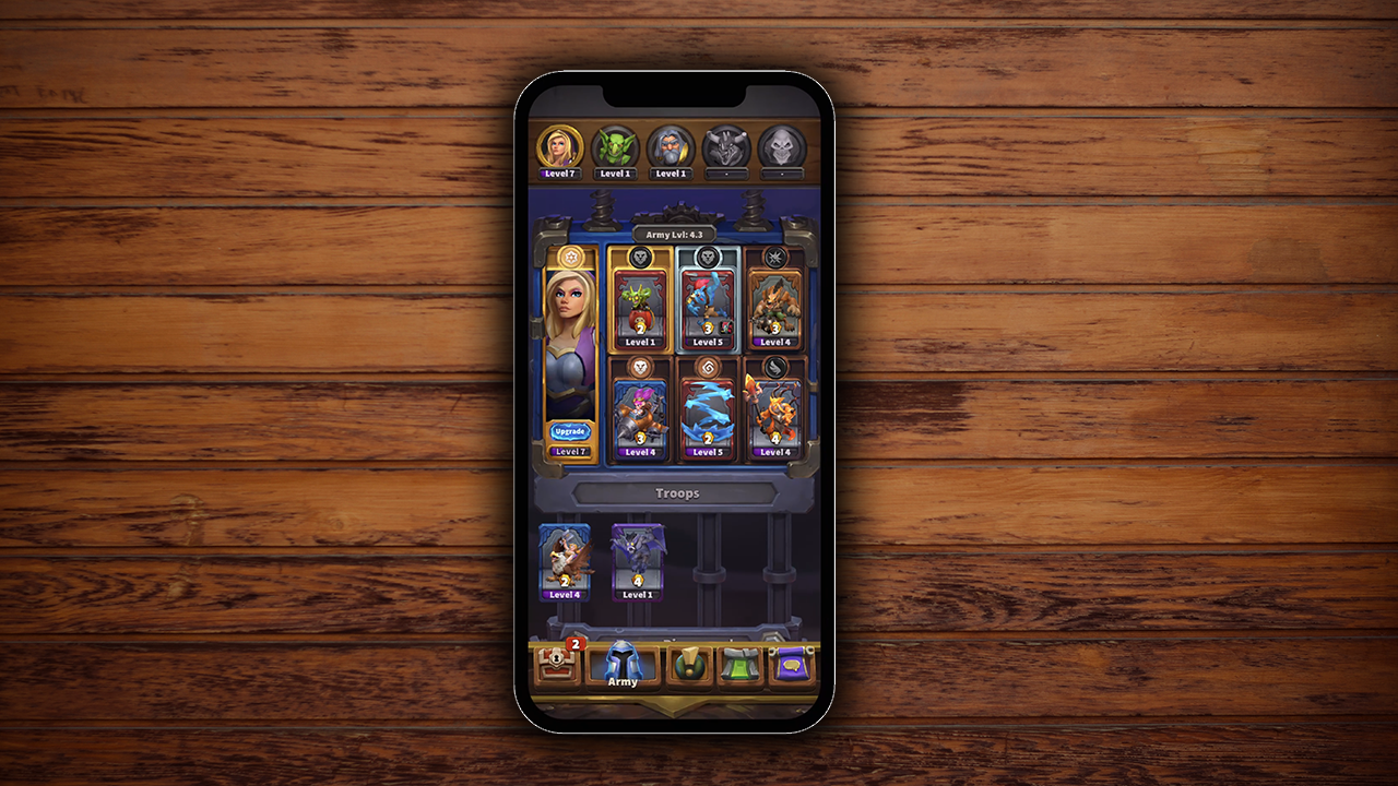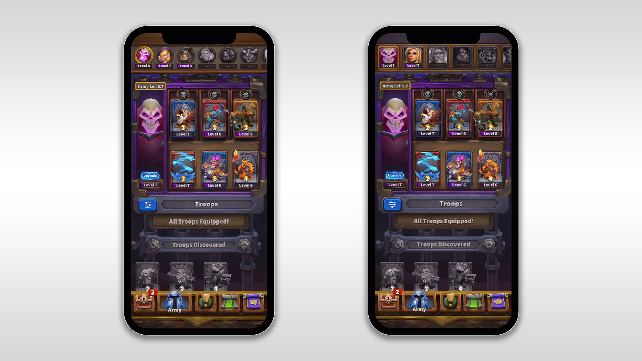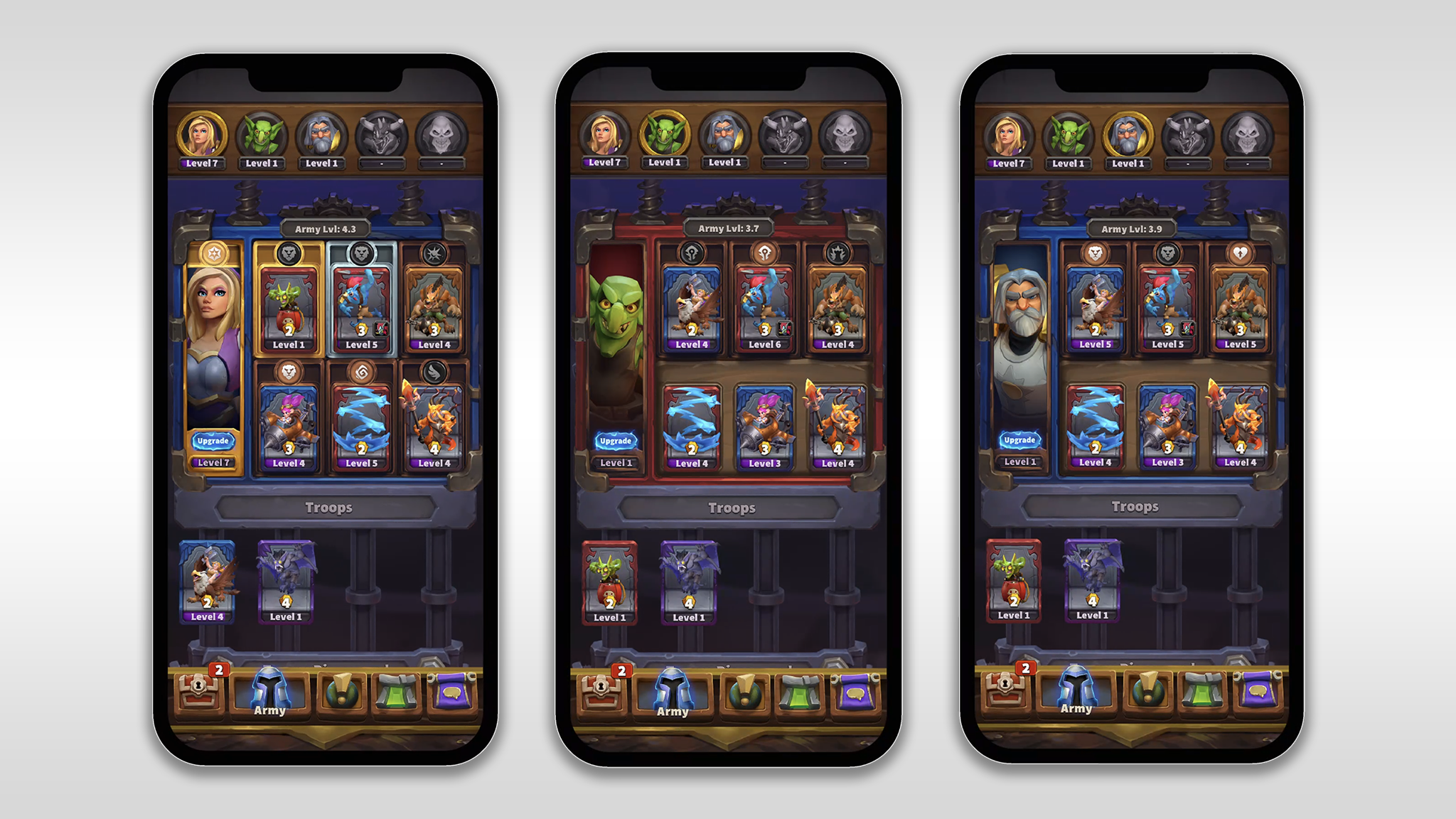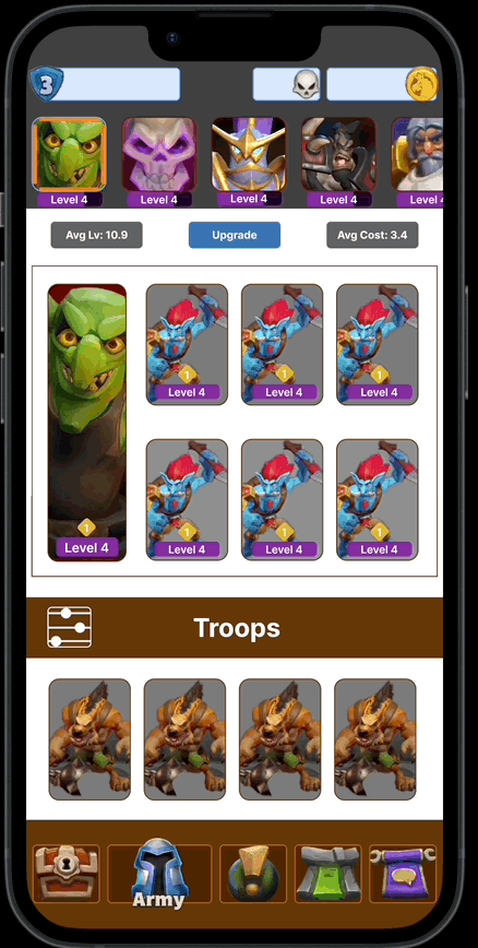 Cosmetic Integration: Future-proofing the game for the addition of cosmetics was achieved by incorporating new sections for Tower skins, miners, and emotes directly within the Army Screen. This seamless integration allows players to customize their armies without introducing unnecessary complexity.